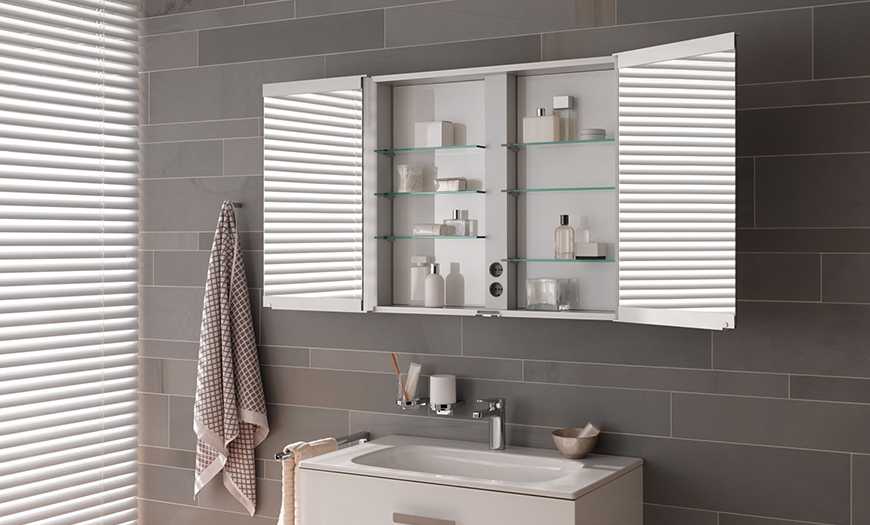 - Шкафчик или полка над раковиной. Отличный вариант — тонкий закрытый шкаф с зеркальным фасадом. Он выполняет сразу 2 функции. На открытой полке скопится много вещей и ванная комната будет выглядеть неряшливо.