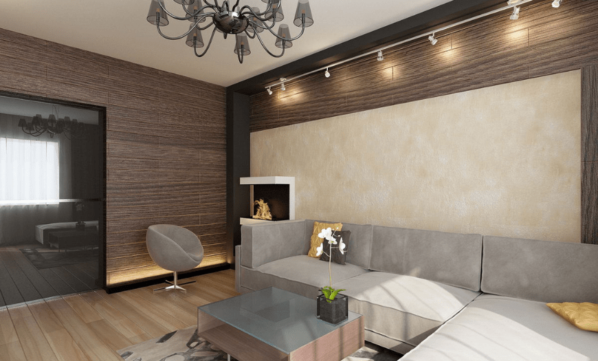 Разделение на функциональные части помогает правильно использовать полезную площадь. Чередуя разные виды отделки (обоев, паркета) визуально проводят границу между зонами. Материалы одного цвета, но с разной структурой поверхности (глянец, матовая, текстура) помогают расставить акценты в комнате.
