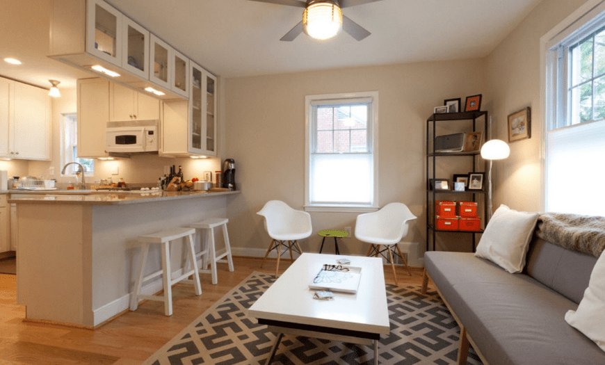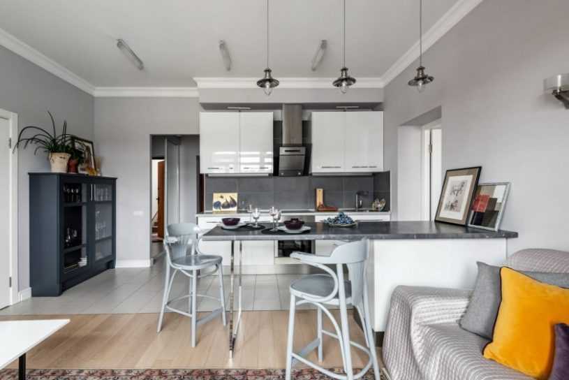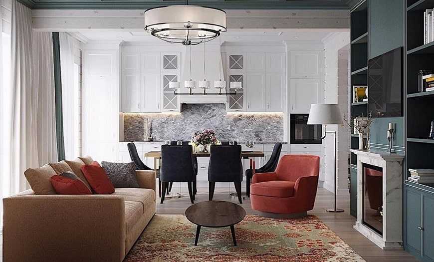 Это хороший пример удачного зонирования в оформленном интерьере кухни гостиной и зоной для чтения. Здесь все сочетается друг с другом, больше ощущается уют.