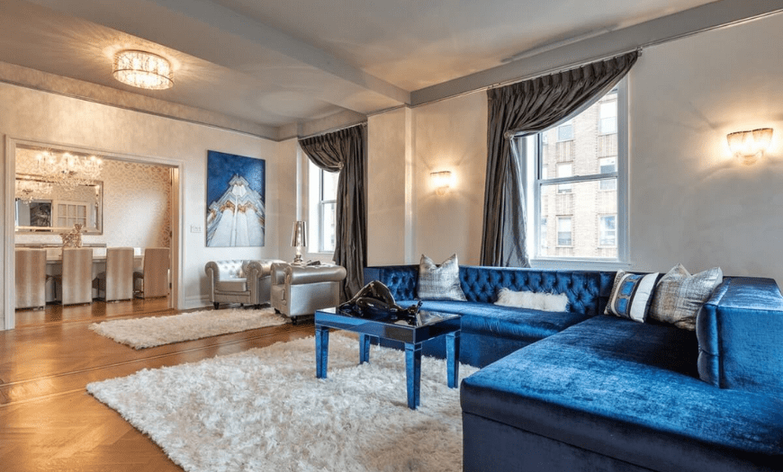 Для квартиры подойдет отделка стен декоративной штукатуркой. Потолок лучше побелить и повесить на него тяжелую люстру со стеклянными или хрустальными подвесками. В них будет красиво играть свет.