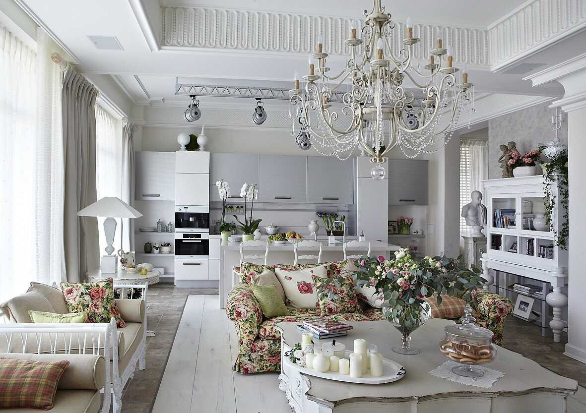 Одной из главных особенностей, которые нравятся в провансальских интерьерах, является белый. Он встречается в тысячах разновидностей и оттенков. Гостиная в стиле прованс — это белая деревянная и мягкая мебель, такие же аксессуары и часто стены. Некоторые элементы интерьера отличаются друг от друга оттенками и текстурой. Белый в провансальской комнате дополняет другие нежные цвета, такие как бежевый, зеленый и пурпурный. Однако он лидирует, а остальные являются лишь акцентами, чтобы подчеркнуть интерьер.