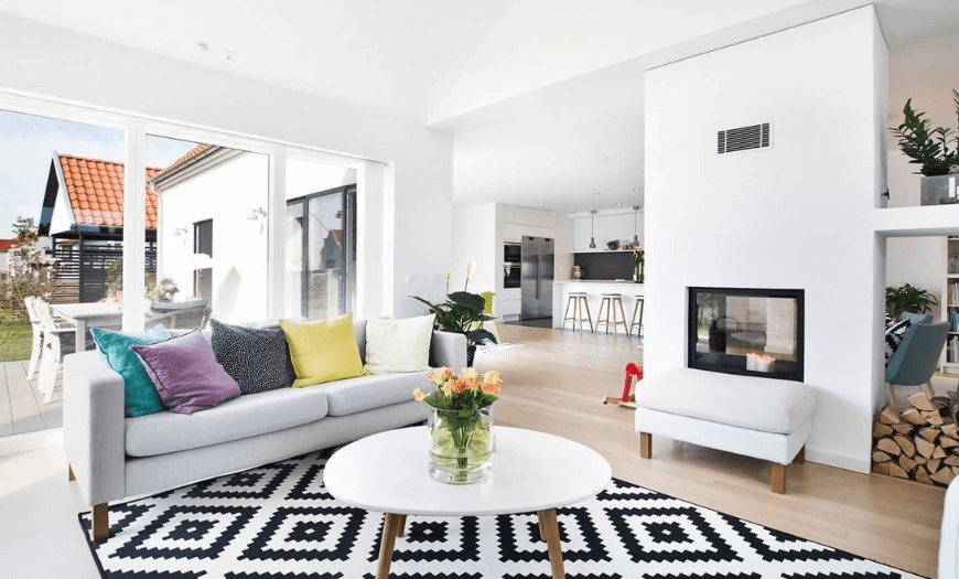 Монохромность атмосферы оживит рабочий камин в гостиной в скандинавском стиле, а также великое многообразие текстиля и характерного декора. Подоконники украшают причудливой формы вазоны с многолетними цветущими растениями.