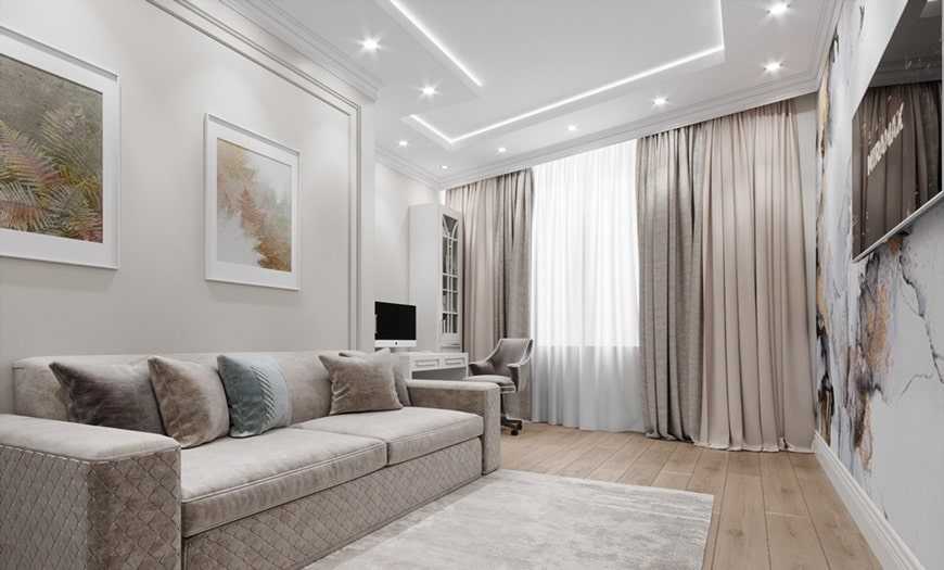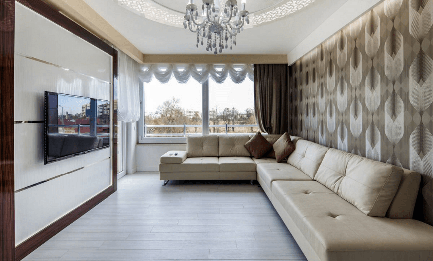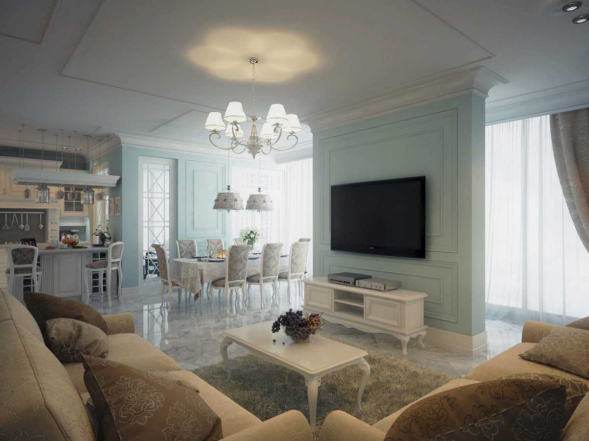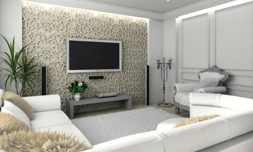 При оформлении зала в светлых оттенках для стен используют виниловые или флизелиновые обои. Универсальный отделочный материал может быть как однотонным, так и с неброским рисунком (фактурой). Дизайнеры часто выбирают рельефное сырье под покраску. В классических комнатах роскошно смотрятся интерьерные ткани и декоративная штукатурка.