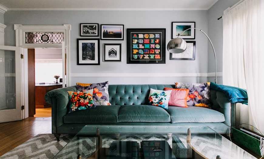 Бархат — эстетичный и приятный наощупь материал. На какое-то время он вышел из обихода, но недавно вернулся в интерьеры. Подобная отделка может применяться в обивке дивана при оформлении в стиле арт-деко. Иногда используются обои с имитацией бархатистой текстуры.