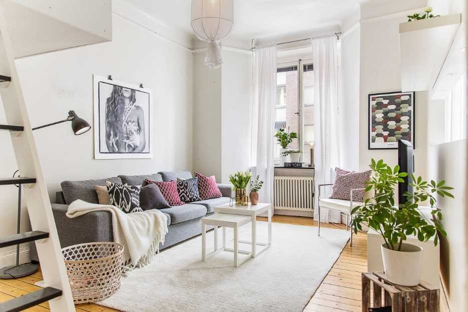 Невероятной популярностью в дизайнерских проектах пользуются скандинавские мотивы. Этот стиль имеет довольно много особенностей, что и делает его по-своему уникальным. Лаконичность оформления позволяет сохранить свободное пространство. Но в то же время такой интерьер точно будет создавать ощущение уюта для каждого члена семьи или гостя. В целом можно сказать, что скандинавский стиль немного схож с минимализмом. Он предполагает светлое, нейтральное оформление стен и мебели, а также большое количество естественного освещения. Такого эффекта можно достичь, есть отказаться от слишком плотных и темных штор. В гостиной они редко используются по назначению. Альтернативным решением могут быть рулонные шторы, тонкий тюль или даже жалюзи.