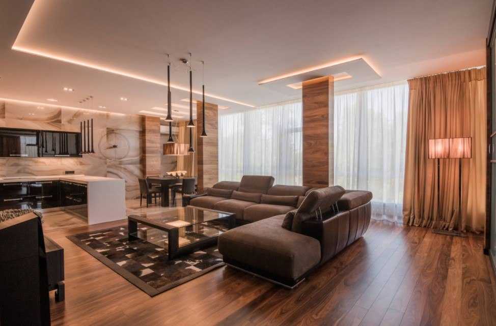 Роскошная древесина венге – настоящая находка для больших и просторных гостиных в классическом стиле. Более темные тона хорошо сочетаются с нейтральным белым или бежевым фоном, а посветлее – с насыщенным бордо, горчичным или даже малиновым.