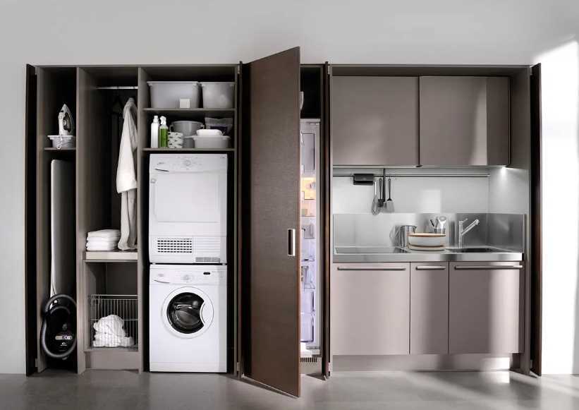 - Встроить бытовую технику. Если позволяет пространство, можно в освободившейся нише установить небольшую компактную модель стиральной или посудомоечной машины. Также на месте кухонного шкафа можно сделать полочку для микроволновой печи.