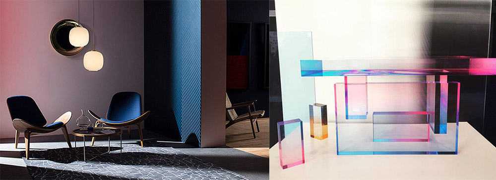 Кстати, о градиентах. На выставке iSaloni в большей степени представлены вертикальные омбре Они повсюду – на стенах, мебели и даже светильниках. В нынешнем году это мягкие сочетания цветов, которые Вы часто встречали на фэнтезийных картинах – и в природе. Эти завораживающие переходы цветов вечернего заката – почему бы не взять их к себе домой?