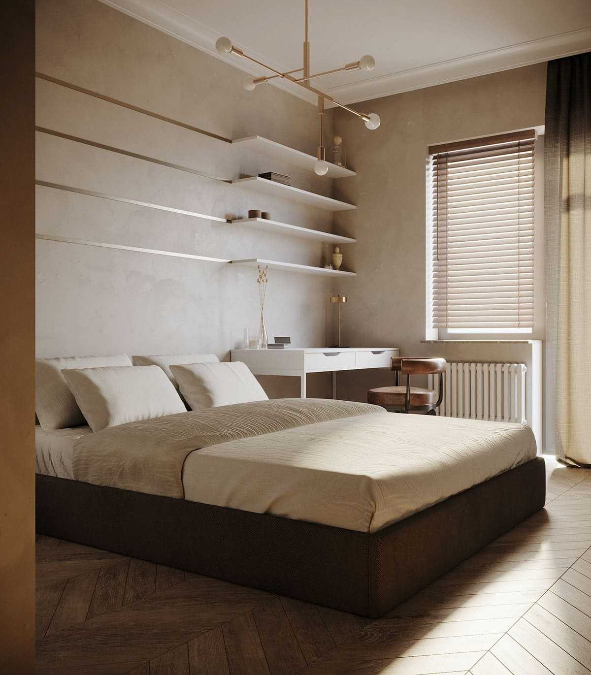 Дизайнеры предупреждают, что если оформить всю спальню в одном тоне цвета беж, то она будет смотреться монотонно и скучно. Выберите пару оттенков бежевого, которые идеально дополнят друг друга, а затем добавьте яркие вещи и предметы интерьера. Даже один цветной аксессуар оживит интерьер комнаты, сделает его выразительным.