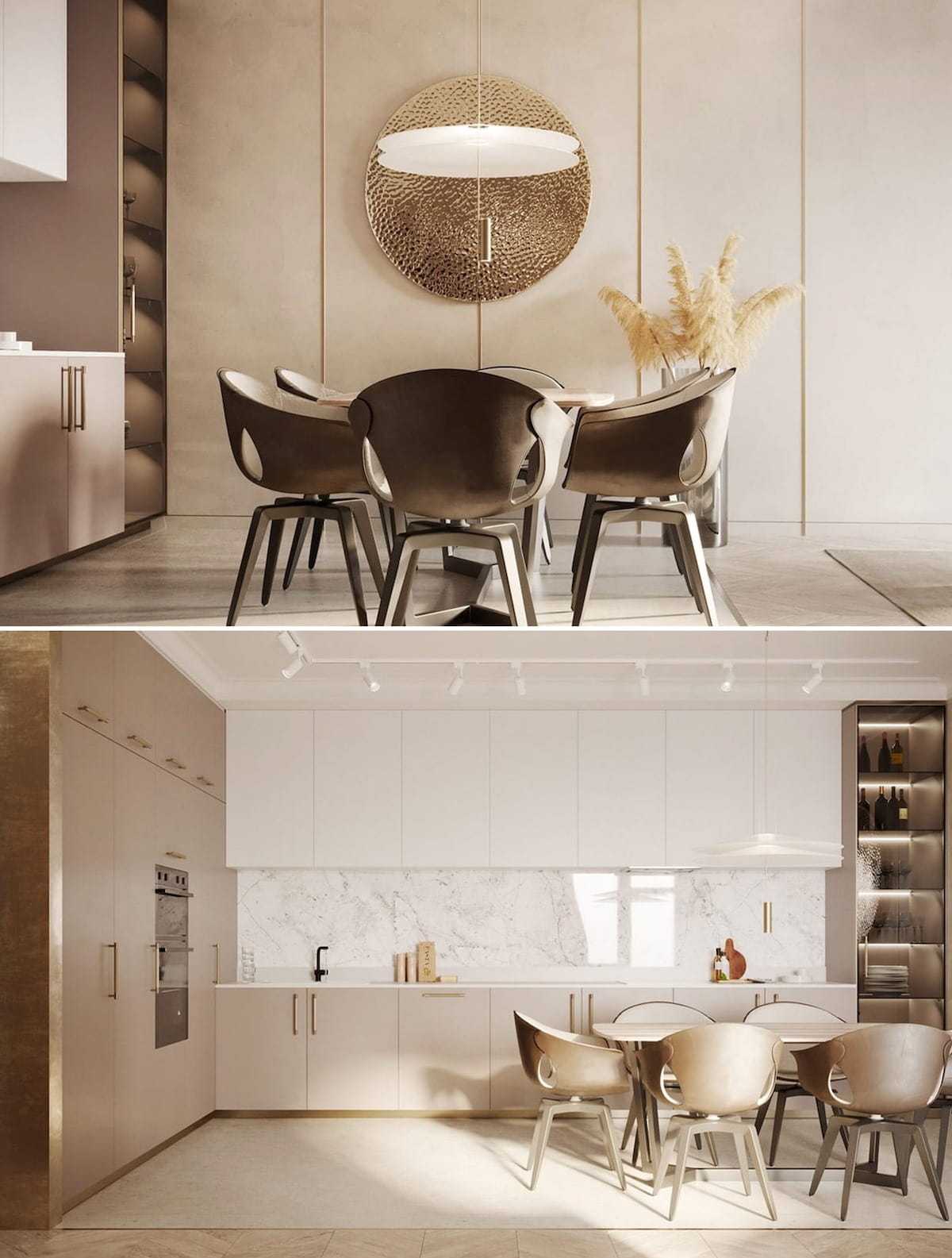 Прежде всего, интерьер в бежевых цветах — это дыхание классики. К нему добавляют мебель и аксессуары в золоте, а также текстильные элементы в сером, желтом, темно-коричневом цветовых решениях.