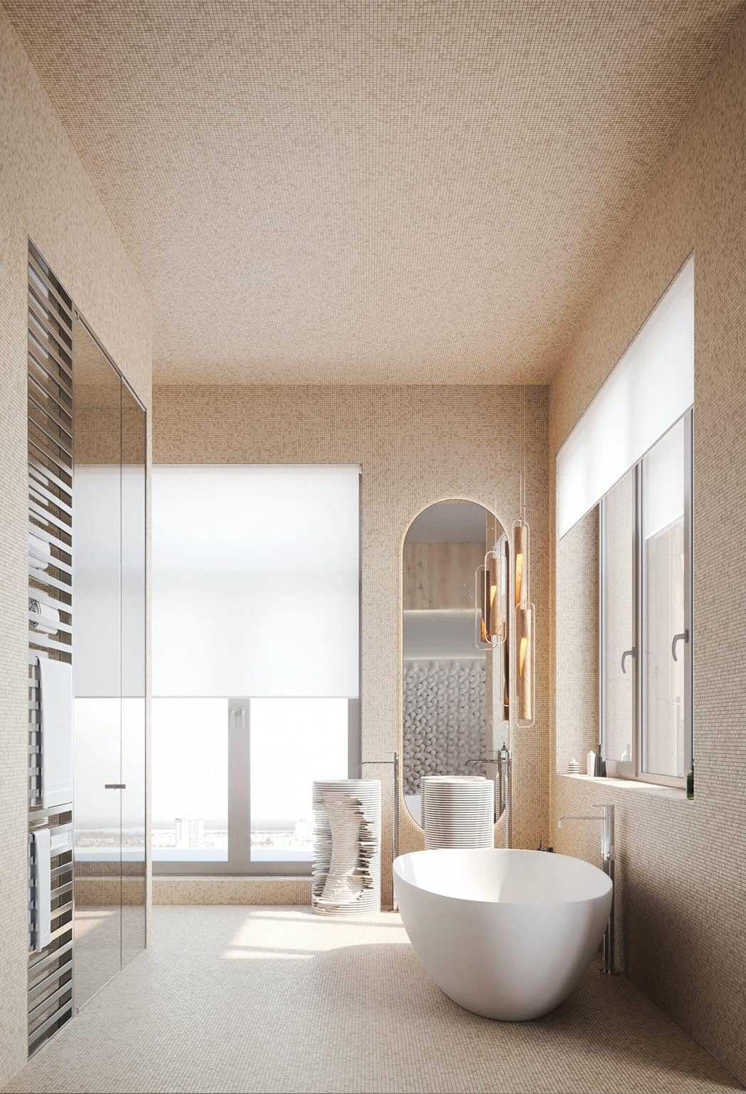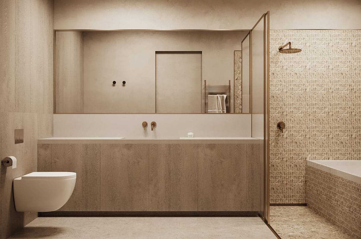 Ванна получилась сдержанной и умиротворенной благодаря бежевому цвету