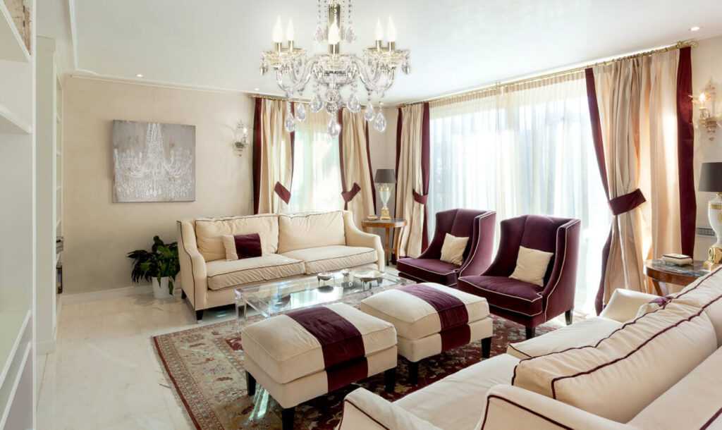 Особенно часто в бежевой гостиной, применяют различный декор синего цвета, например, это могут быть подушки, ковры или занавески. Еще больше подчеркнуть синие вкрапления помогут фиолетовые или лавандовые оттенки.