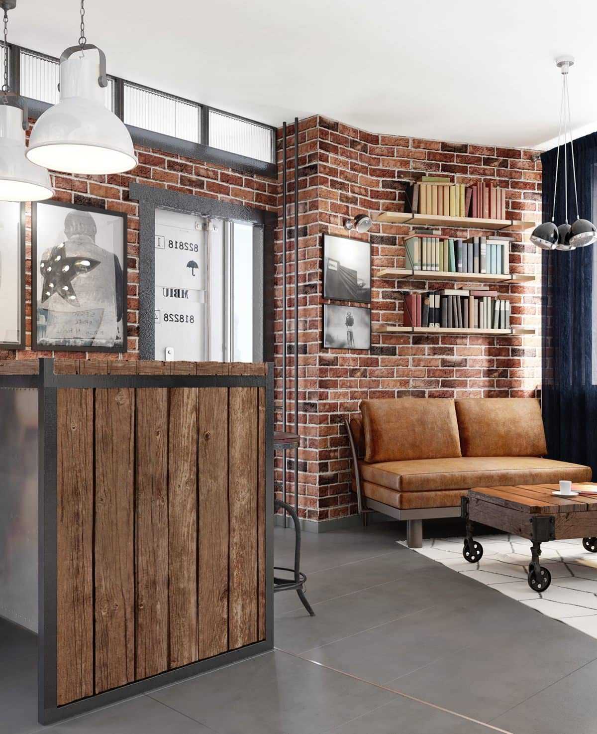 Кирпичные стены в стиле лофт без какой-либо обработки по-прежнему остаются самой популярной. Это отличный прием для создания нужного настроения. Кирпич можно покрасить в белый цвет, но это не должно делать невидимой конструкцию кладки.