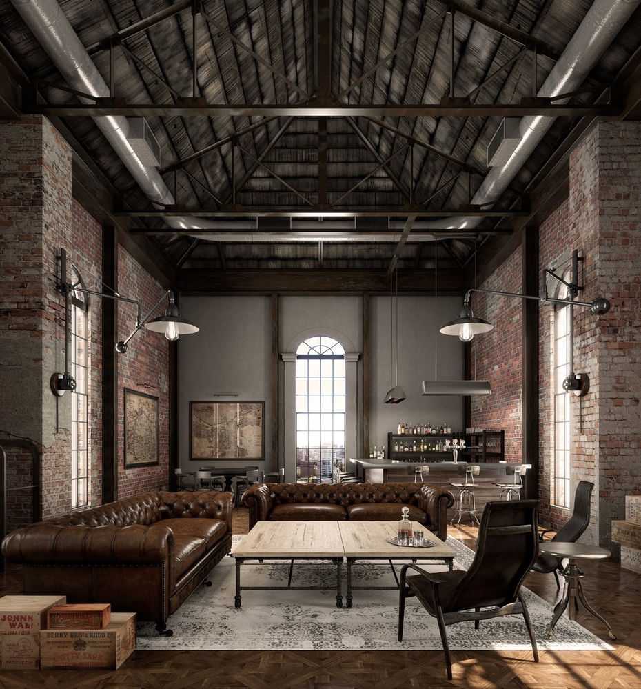 Классический интерьер в стиле лофт с большими и просторными площадями