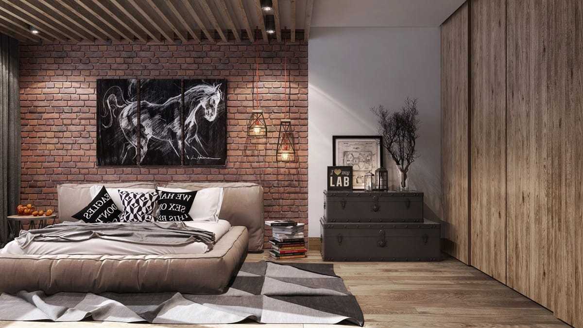 Удачное сочетание кирпичной кладки с остальными цветами в интерьере спальни