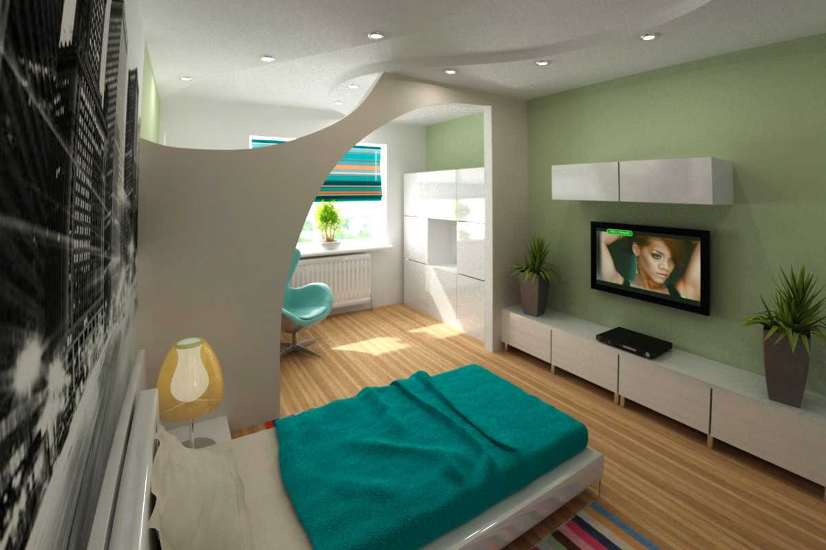 Кроме того, зону спальни от гостевой можно отделить гипсокартонной перегородкой с нишей, в которую устанавливается телевизор. Стену с ним можно выделить отделкой другого цвета. Как сделать перегородку, всегда можно узнать из инструкций в интернете.