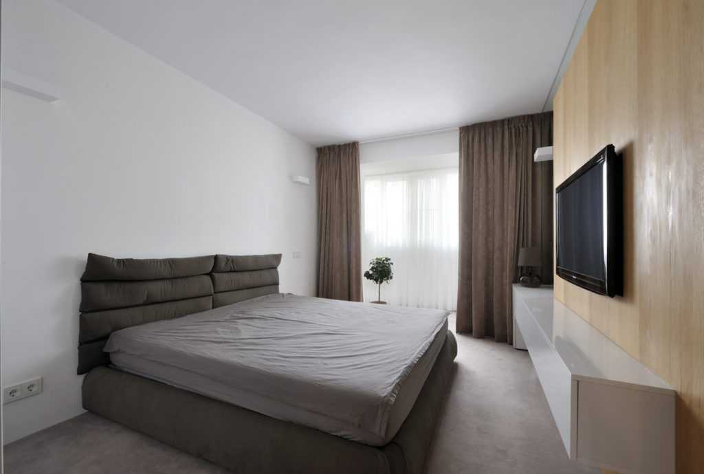 Телевизор в спальне необязателен. Его чаще смотрят в гостиной или на кухне. Если он необходим, его можно повесить на стену напротив кровати или на кронштейн в середине комнаты.