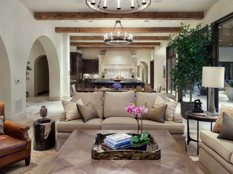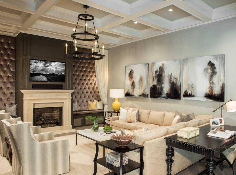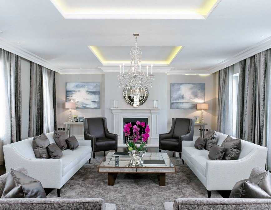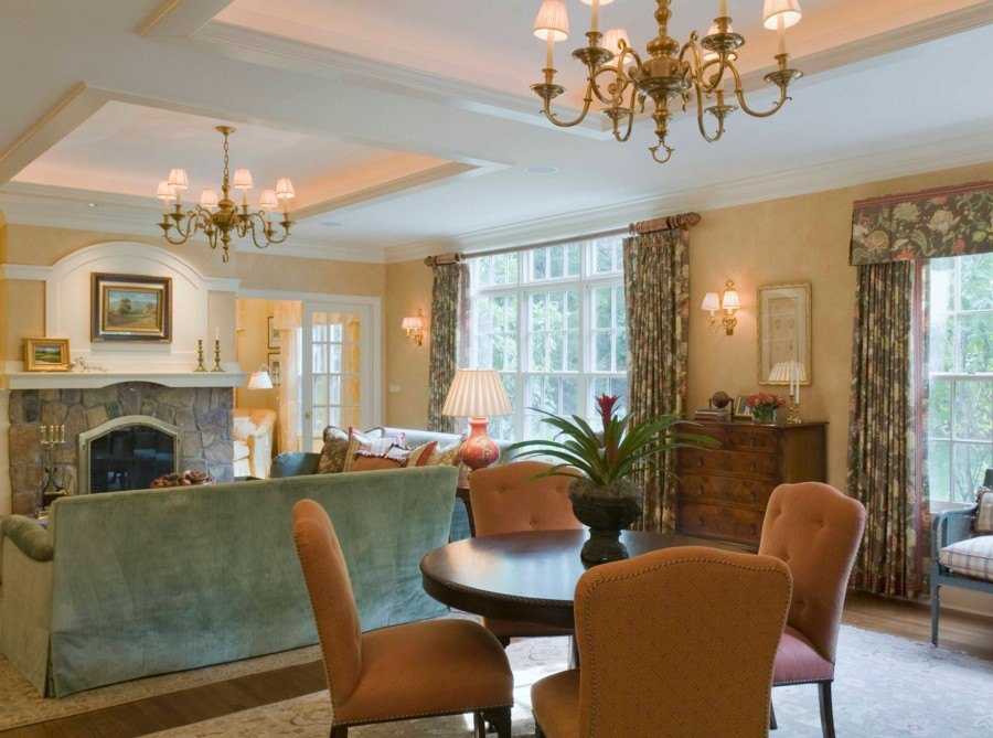 В приоритете использование яркого и теплого света, которое способствует улучшению настроения и располагает к приятному общению. Для гостиной с высоким натяжным потолком можно подобрать более массивную люстру. Такое изделие наделит обстановку зала роскошью и торжественностью. Дорогая конструкция из хрусталя выгодно дополнит интерьер, выдержанный в классической стилистике.