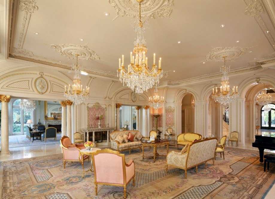 На фото подвесная люстра и бра в классическом стиле составляют единую композицию в роскошной гостиной бежевого оттенка. Золотой цвет, стекло, вельвет, лепнина и глянец уместны только в просторных комнатах.