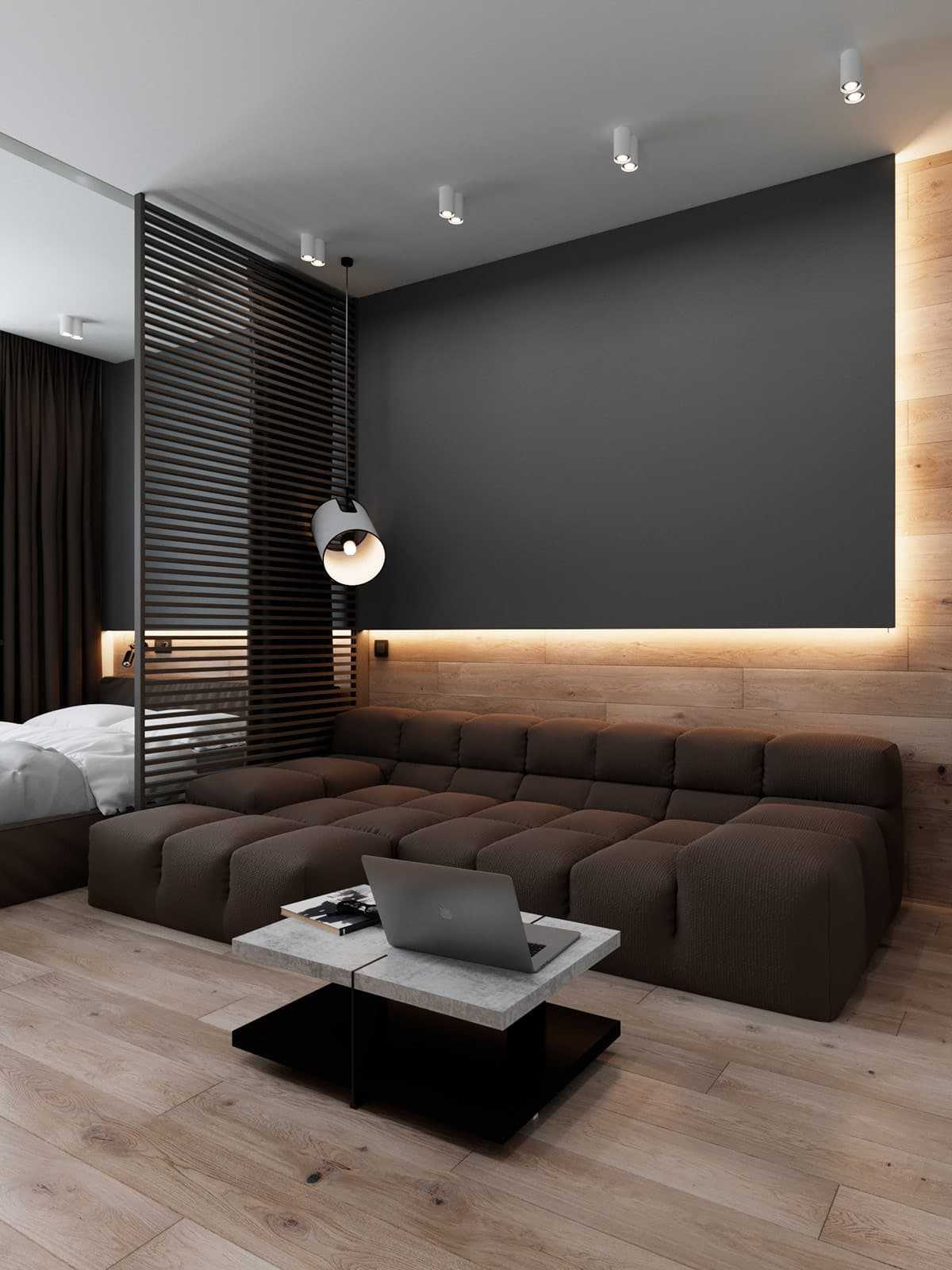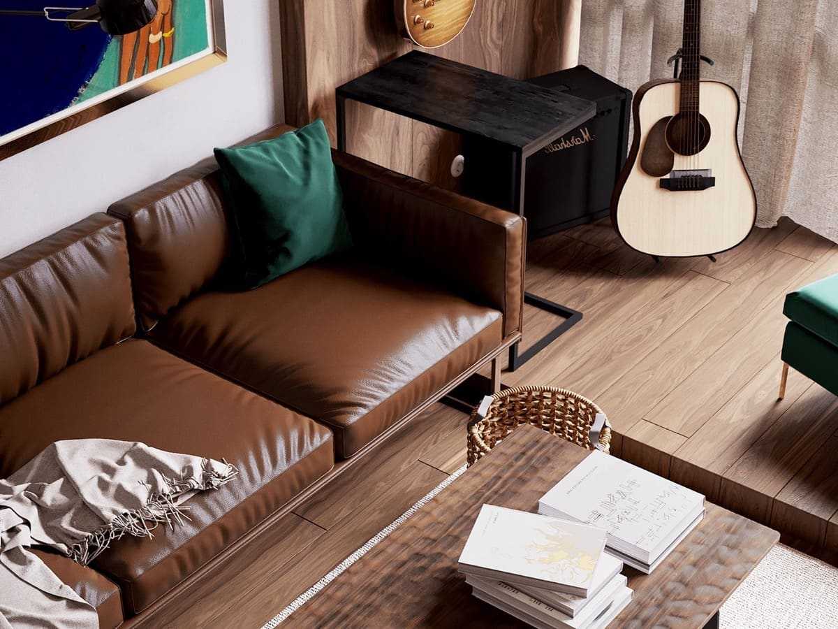 Большой кожаный диван в коричневом цвете идеально подойдет для брутального мужского интерьера