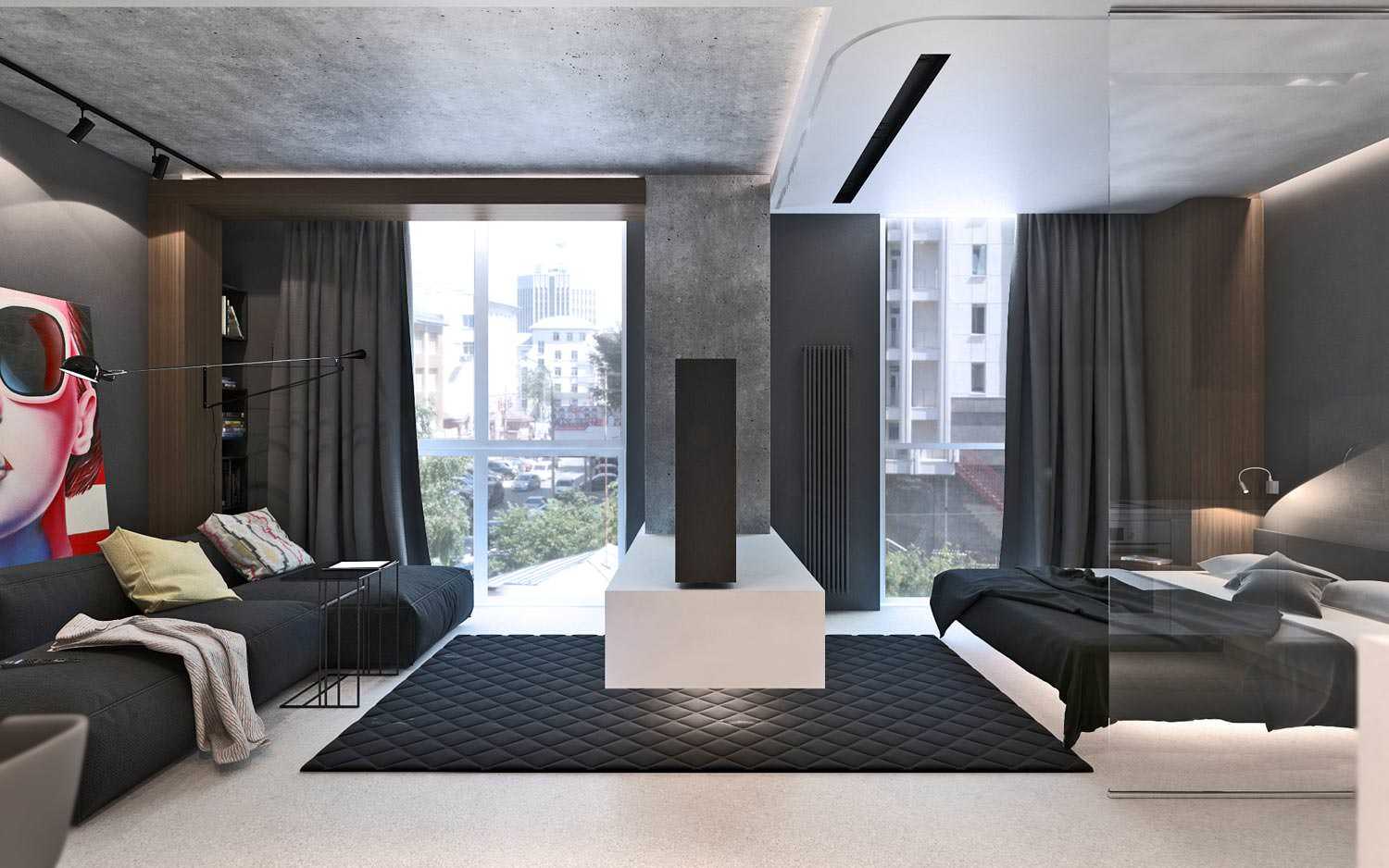 Для создания модного оформления помещения предлагается соединить два супертренда интерьерного дизайна. Вы можете использовать вместо стен стеклянную перегородку с раздвижной дверью.