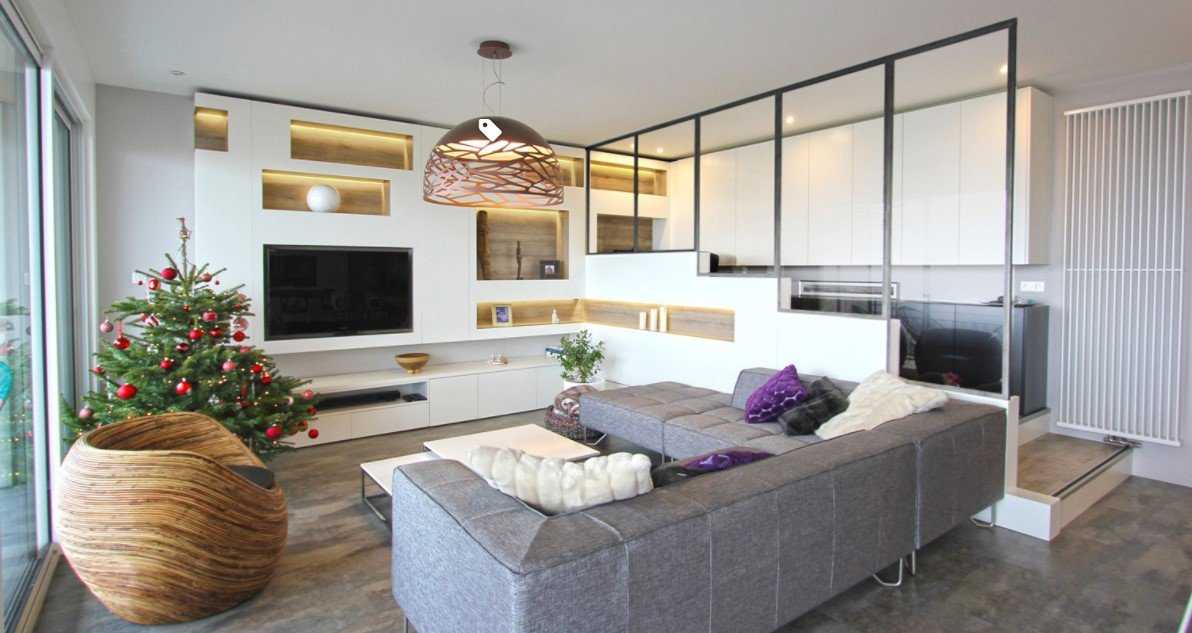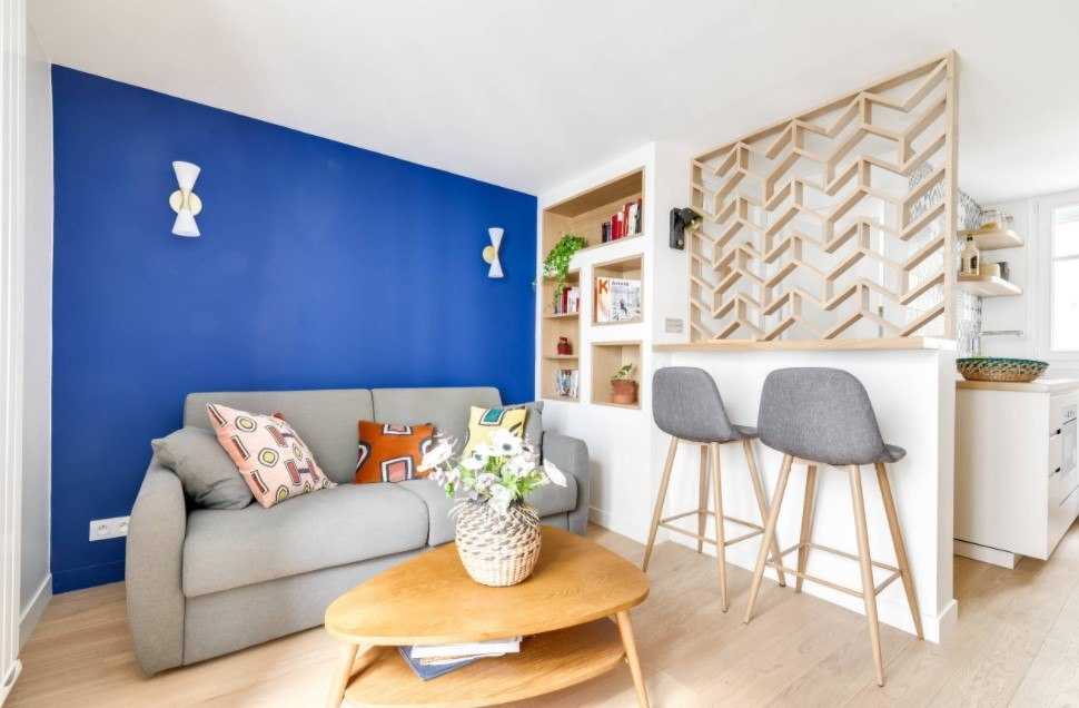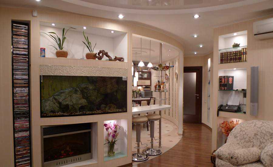 В тренде перепланировка с объединением разных функциональных блоков квартиры. Для осуществления этой идеи частично или полностью сносится стена между кухонным и жилым блоками. В образовавшийся проем встраивается модуль из ГКЛ, дополненный кирпичной кладкой, в который включены разные элементы – фигурная перегородка, большая фантазийная арка или конструкция в романтическом стиле с барной стойкой.