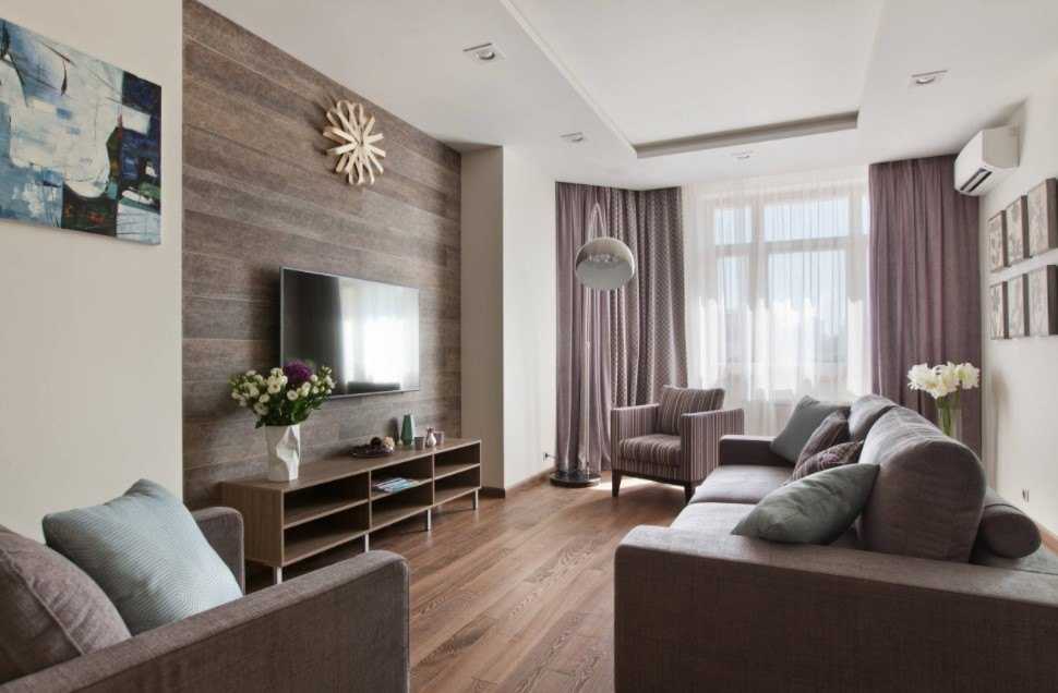 Всевозможные деревянные детали либо ламинат в дизайне гостиной комнаты совсем не редкость. И помимо использования подобных материалов для отделки пола либо стен, их вполне можно применить для оформления ниши. Смотрится такое решение достаточно солидно и отличается практичностью