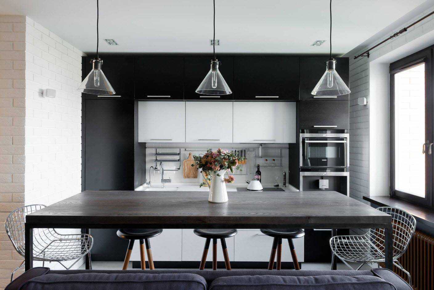 - Обеденная зона выделяется высокой узкой конструкцией с барной стойкой, которая выполняет функцию стола. Эффектно смотрится асимметричный свод.