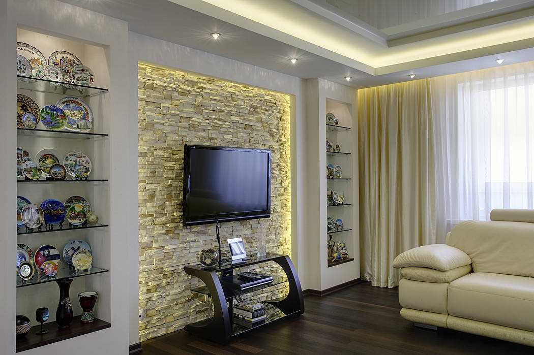 Можно облицевать стену в гостиной над предметами мягкой мебели, и тогда дополнительный декор этого помещения не потребуется.
