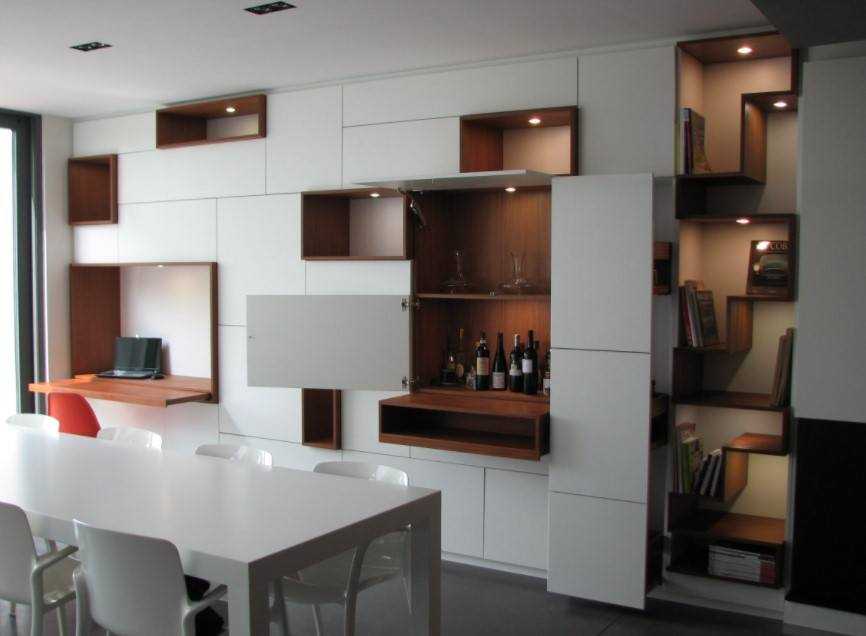 Мини-кухни чаще всего встречаются в квартирах-студиях. Они расположены рядом с входной дверью. Кухонная ниша должна обеспечивать сборку всей необходимой бытовой техники, а также хранение утвари, соответствуя по дизайну примыкающим комнатам. Маленькая кухня в углублении — отличный вариант для небольших площадей. Кухонная ниша будет одновременно и эстетической, и функциональной