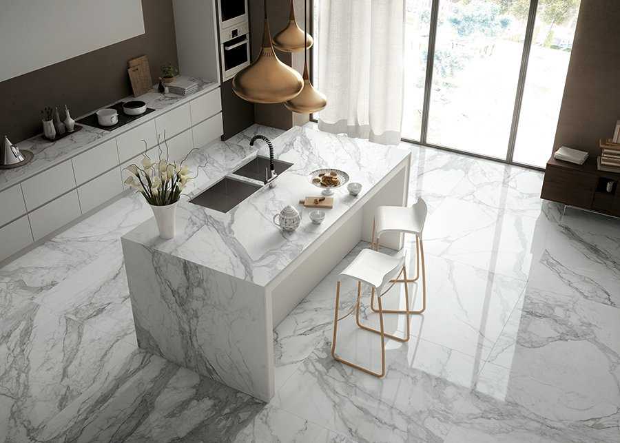 По сравнению с натуральным белым мрамором, кафель менее прочный — но его износоустойчивости зачастую более, чем достаточно для оформления жилых помещений. Еще один недостаток — швы между элементами керамогранита или плитки. Но если работа будет произведена качественно, они не должны бросаться в глаза.