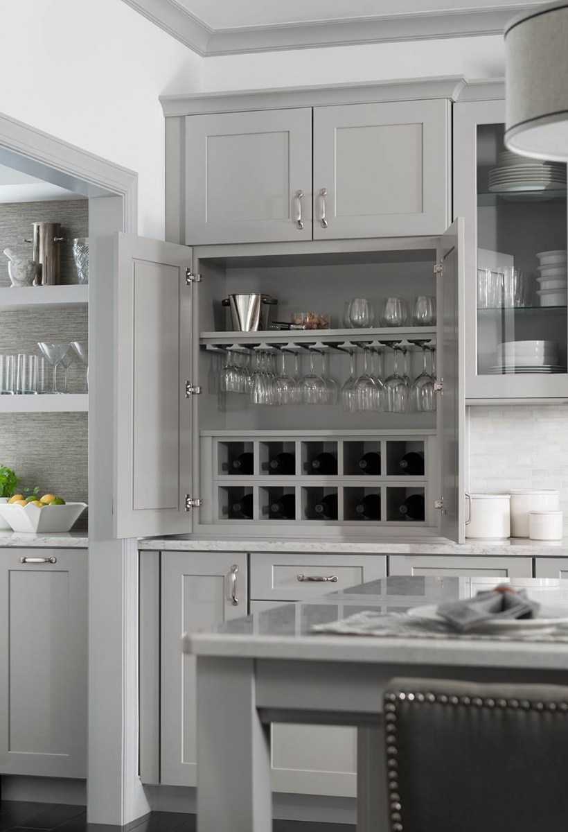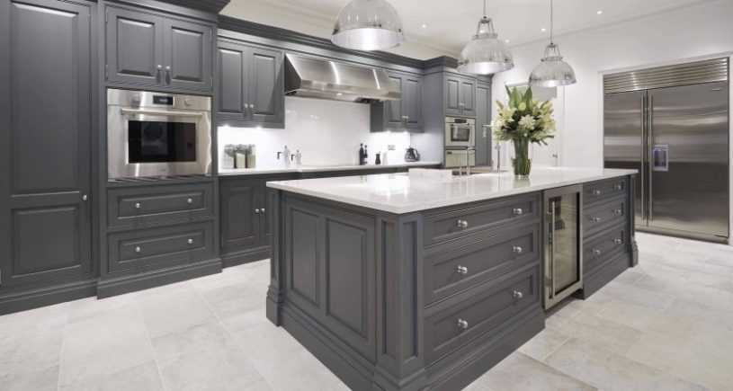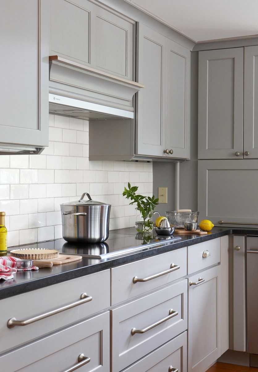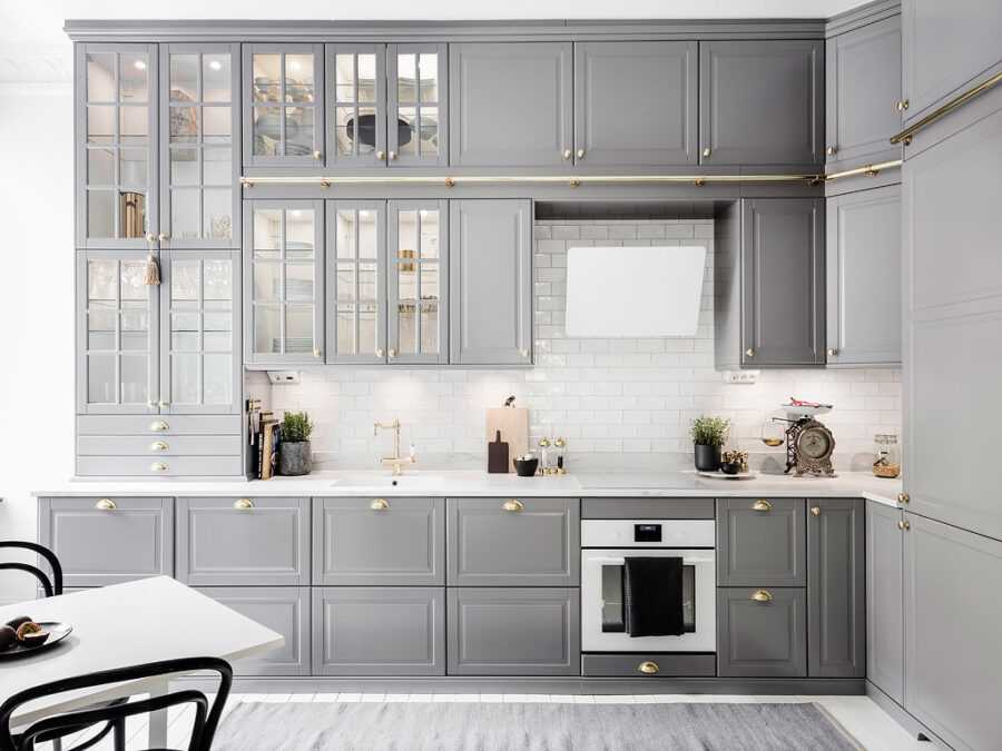 Современная классика в серых тонах — это модная альтернатива бежевой классике. Отлично сочетается с фурнитурой в виде золотых ручек, оформленных под античную бронзу, латунь, с коваными изделиями и т. п.
