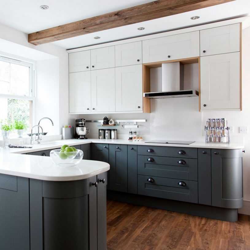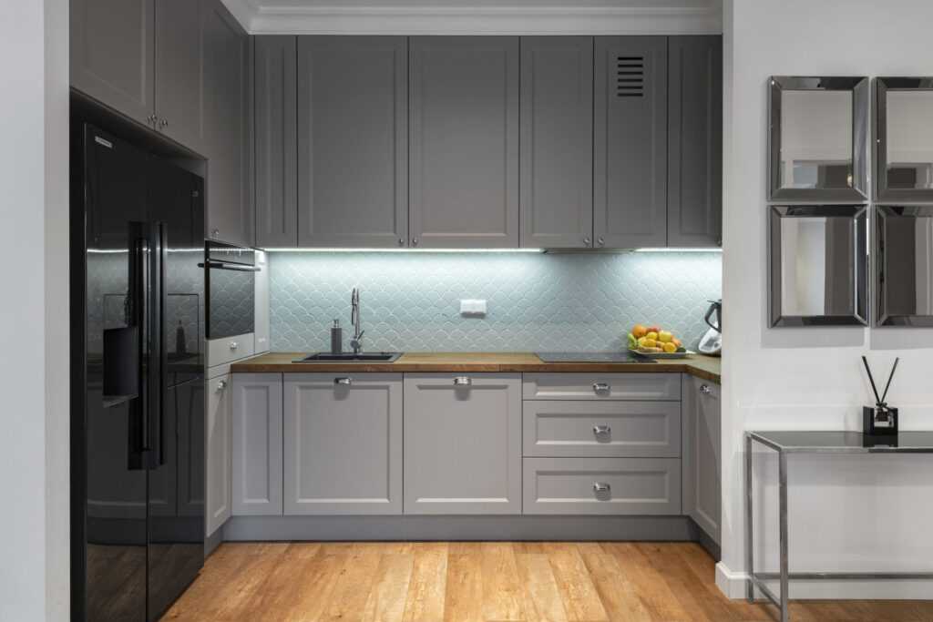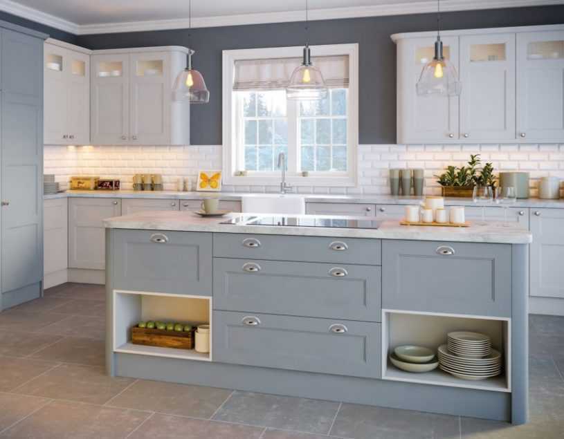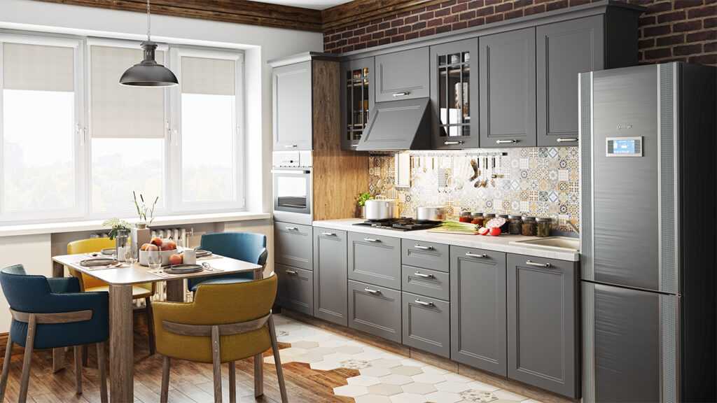 Гарнитур серого цвета с филёнчатым или гладким фасадом в данном случае будет смотреться идеально.