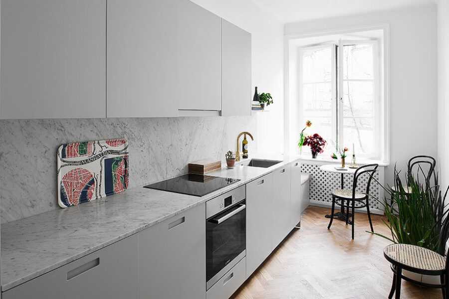 Белый гарнитур — частый выбор для скандинавской кухни. Чтобы подчеркнуть стилевую направленность, можно выбрать обои синие, бежевые, светло-голубые или светло-серые.