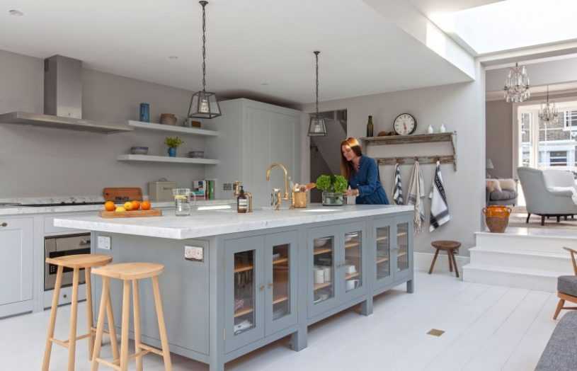 Матовый гарнитур в дымчатых тонах считают удачным решением. Если вы хотите сделать дизайн комнаты более глянцевым, используйте блестящие поверхности. Сочетая их с техникой из нержавейки, можно добиться поистине удивительного эффекта.
