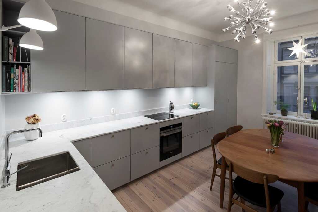 Графитовую или светло-серую кухню можно отделать и более дешевыми материалами, например, столешницей из ламината. Вы легко найдете модели, имитирующие дерево или камень, но также однотонные, например белые.
