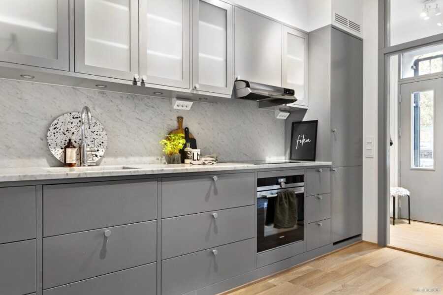 При покупке мебели учитывают площадь, конфигурацию кухни. От этого зависит формат, расположение гарнитура. Модной вариацией считается модульный «конструктор» без верхних шкафов. Разные модели подобных изделий в широком ассортименте представлены среди серых кухонь ИКЕА.