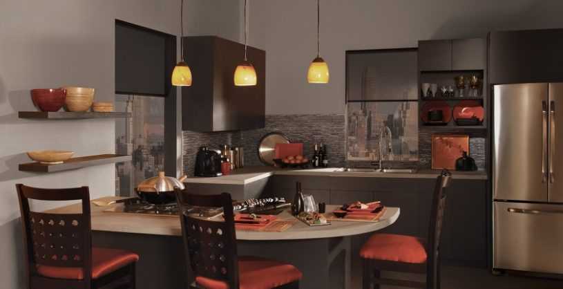 Тёмные цвета придадут кухне брутальности. Если же помещение небольшое, то лучше от них отказаться в пользу светло-серых тонов или просто оставить тёмные тона для оформления фасадов нижних шкафчиков, а верхние сделать светлыми.