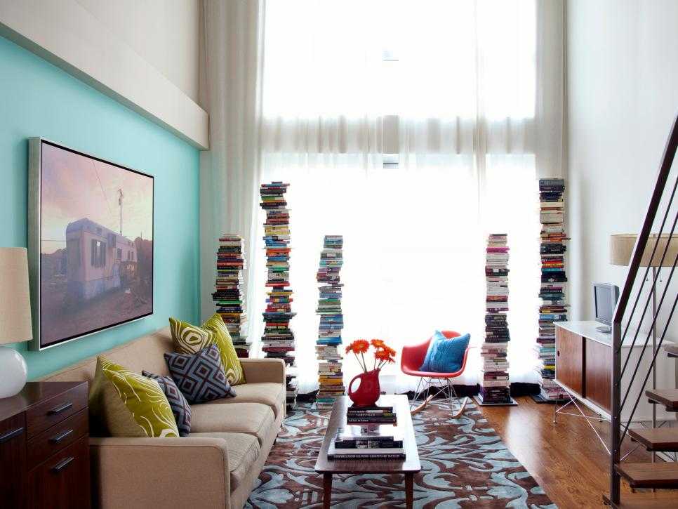 - Покраска одной из стен в другой цвет сделает интерьер гостиной стильной и необычной