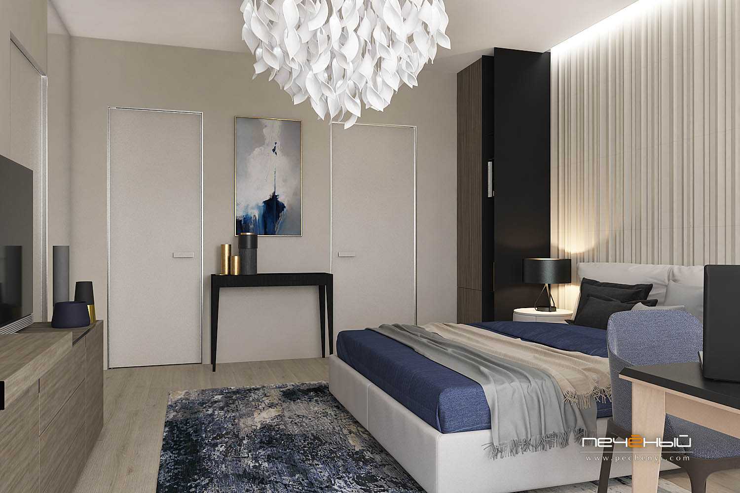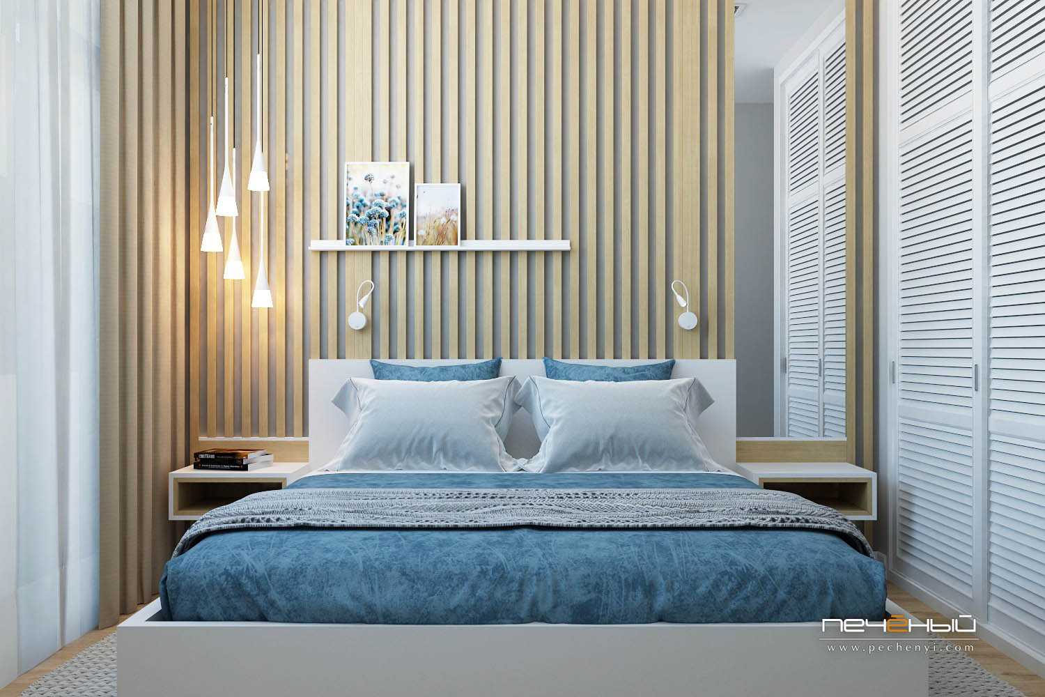 Многие согласятся, что ради просторной гардеробной можно и пожертвовать пространством спальни. А чтобы этот светлый серо-синий интерьер визуально смотрелся легче, мы использовали в оформлении стены деревянные вертикальные рейки. Вместе с жалюзийными дверцами гардеробной они добавляют воздуха в крошку-спальню и создают дополнительные горизонтальные и вертикальные линии.