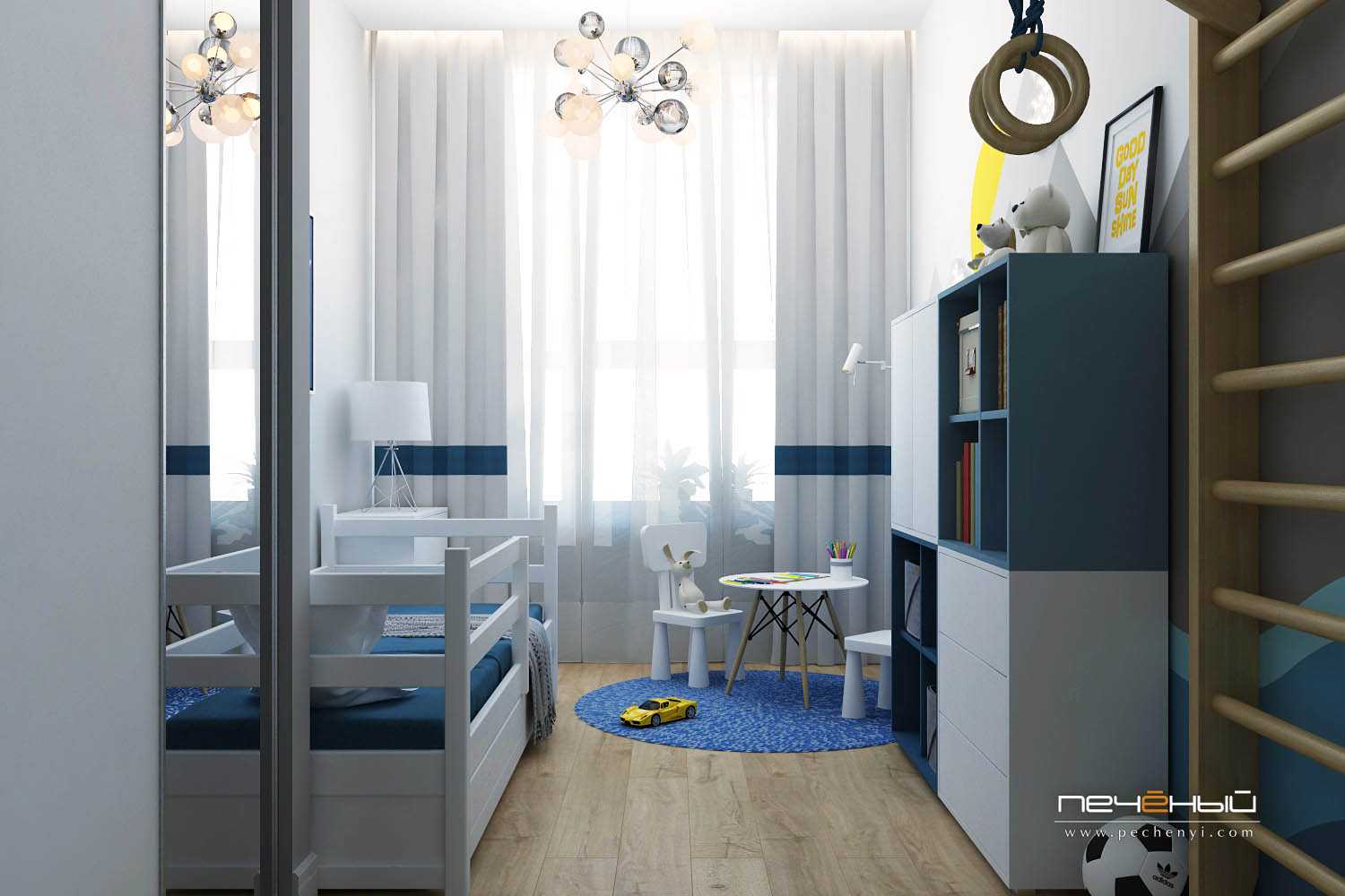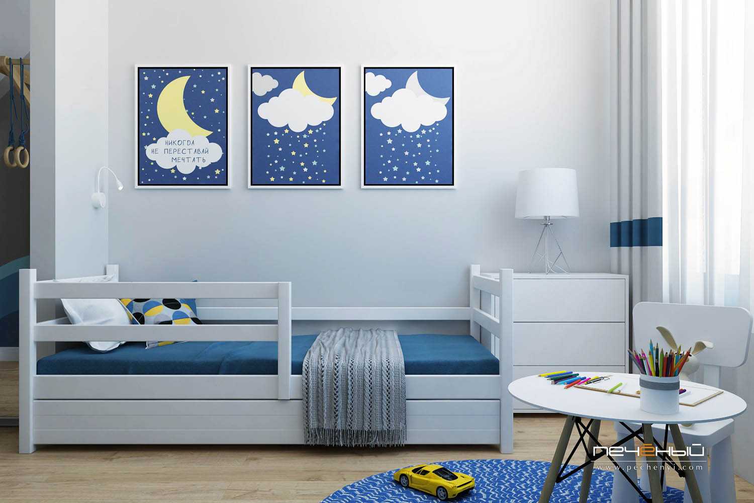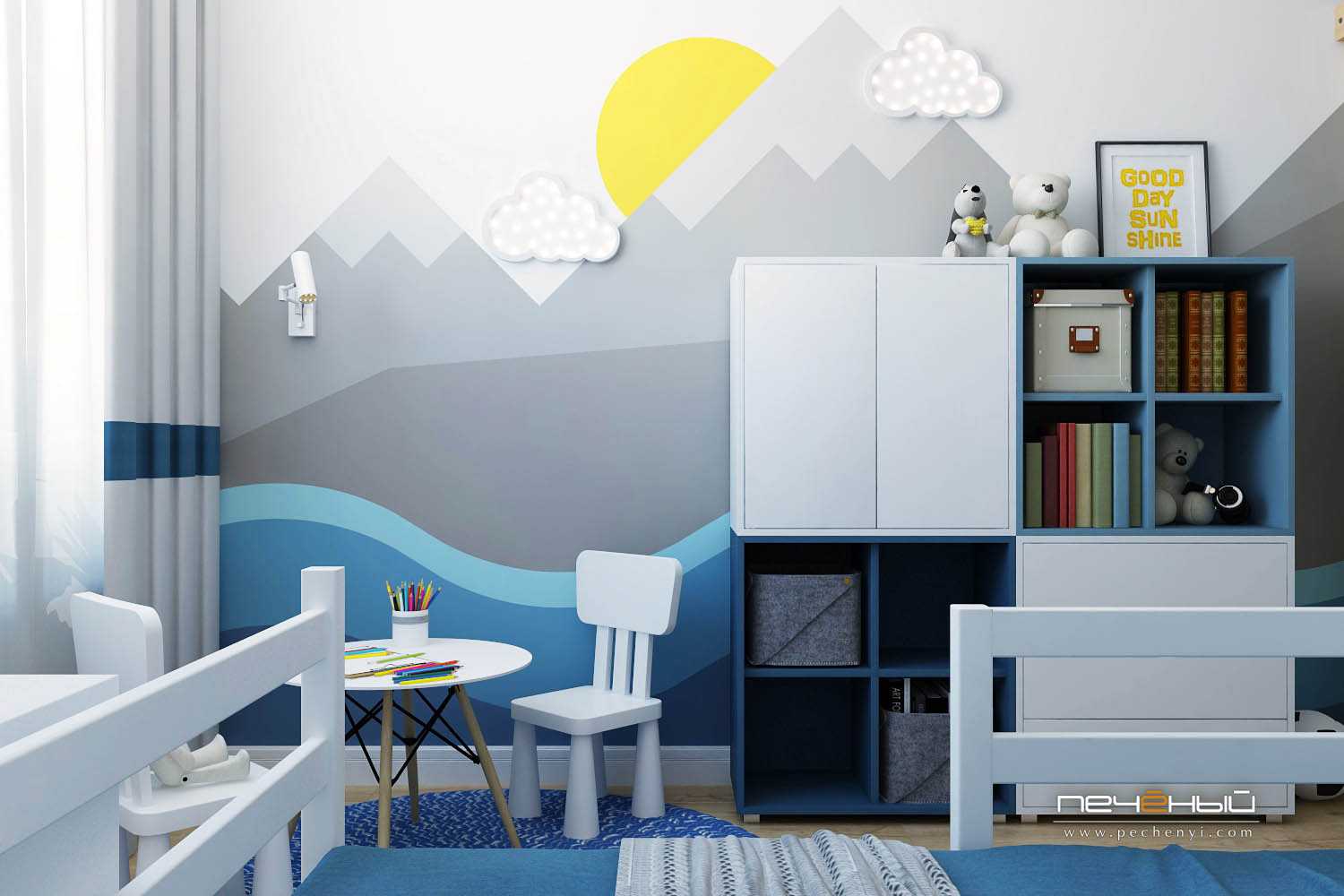 Использовать в оформлении детской серый и синий цвета вовсе не значит сделать её унылой. А если добавить к этой гамме ещё и жёлтый оттенок, получится яркий и позитивный интерьер!