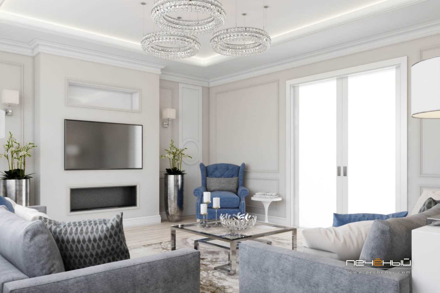 Ещё один вариант соединения в интерьере современной лаконичности и классической изысканности. Серо-синяя гамма тут очень уместна – она добавляет графичности и в целом, гостиная смотрится свежей и очень нарядной.