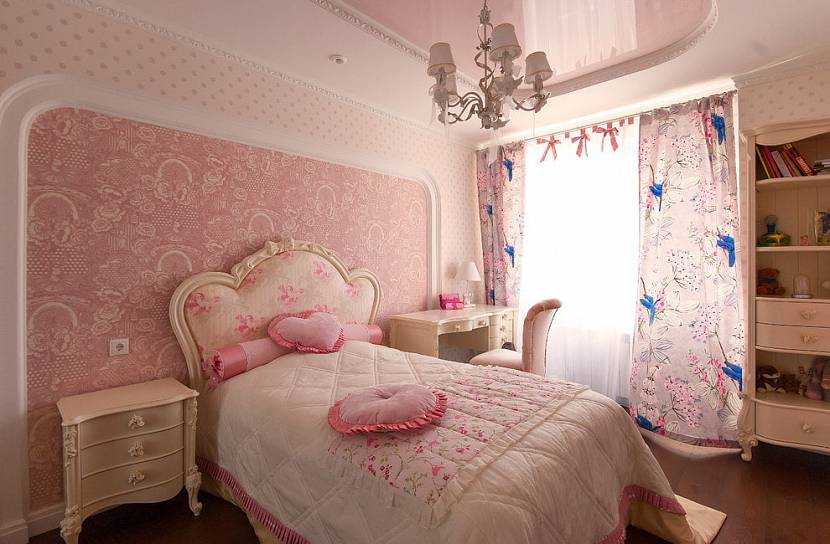 Для создания классического дизайна стены обычно оформляют однотонными розовыми обоями, которые дополняют мебелью плавных форм.