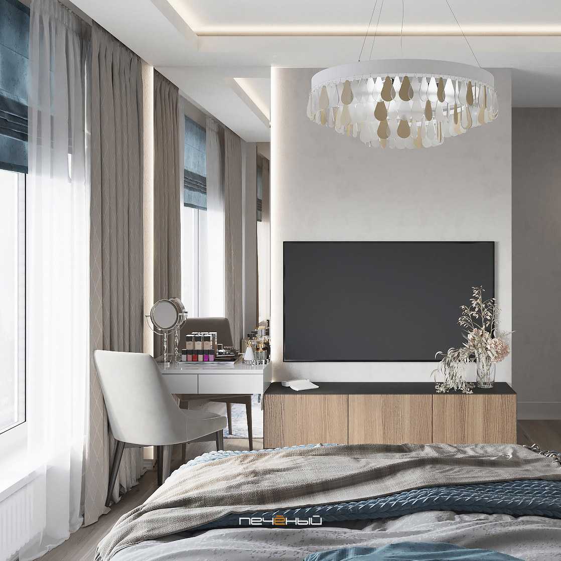 Эта современная спальня получилась лёгкой, светлой и умиротворяющей. Очень правильное настроение для спальни. ![]()