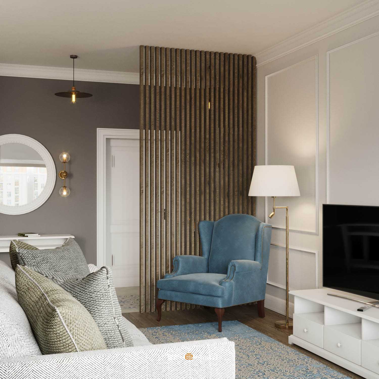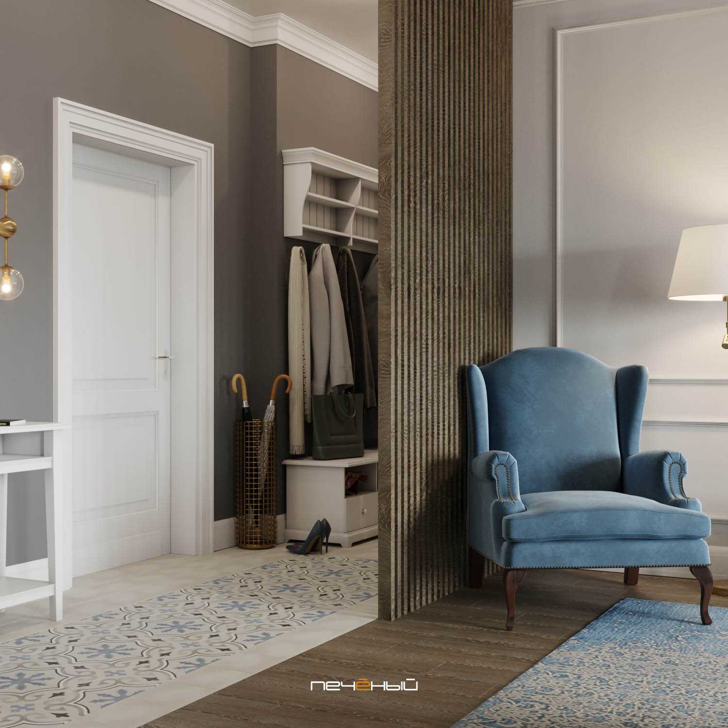 А вот пример гостиной в стиле неоклассика. Здесь серый цвет исполняет роль акцентного фона, а синий – акцента-предмета. Плитка в прихожей и ковёр как бы объединяют эти тона вместе, что придаёт всему интерьеру законченность.