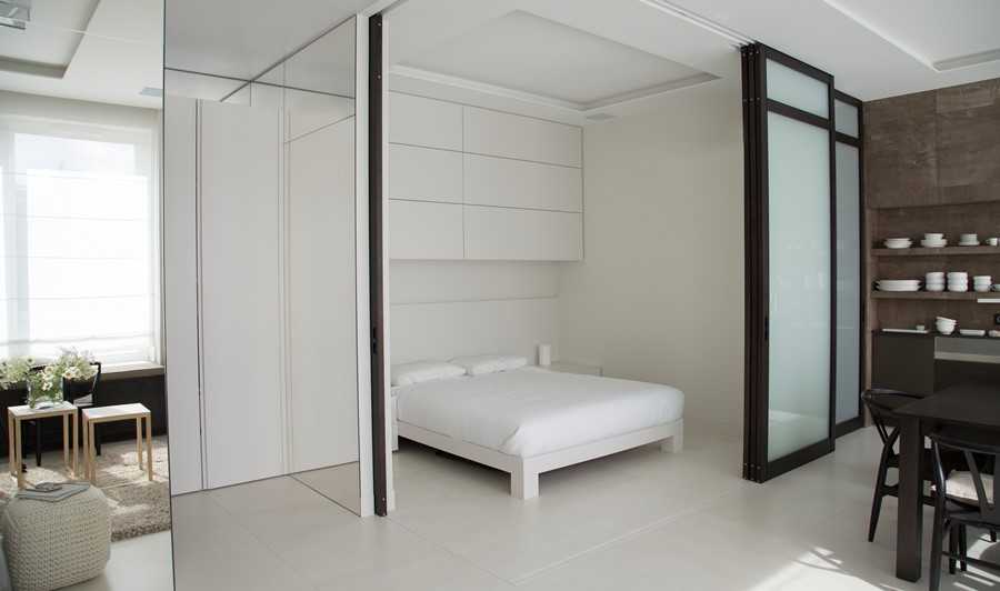 Самым ценным в комнате окажется кровать, так как она должна быть спрятана от посторонних глаз. Удачным выбором отгородить спальню от зоны отдыха, при этом не забрав пространство.