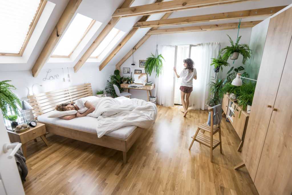 У вас уже есть идея мансардной спальни, но вы до сих пор не знаете, как устроить мансардные окна? Жалюзи, которые будут ограничивать интенсивность солнечного света утром, будут подходить лучше всего, но после открытия вечером они позволят вам полюбоваться звездным небом. Делайте ставки на модели из затемненной ткани — вы можете выбирать из множества цветов, которые помогут вам разнообразить расположение. Благодаря жалюзи в спальне на чердаке не будет слишком жарко в течение дня.