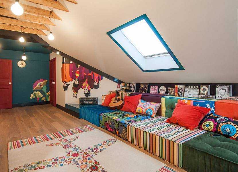 Чердачное помещение позволяет не только оформить спальное место для ребёнка, а отдельно выделить комнату для игр, зону для обучения, спортивный уголок и т.д. По сути, можно создать отдельную копию квартиры для подростка.
