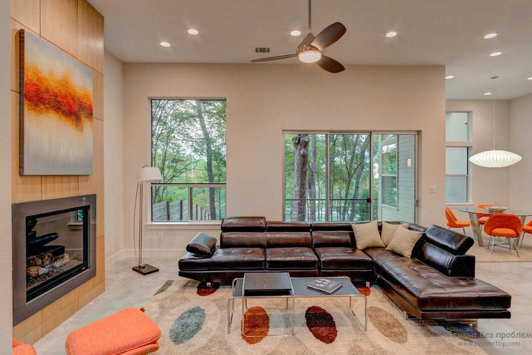 - Оформляя просторную комнату, сначала желательно определить положение центральной люстры. Её размеры зависят от стиля оформления и площади помещения. Если люстры для освещения недостаточно, можно установить точечные светильники прямо на потолке, или настенные — по периметру.