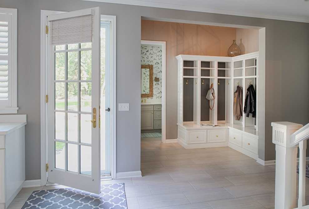 - модель в прихожую — перекладина или открытое пространство с крючками для верхней одежды, нижние полки для обуви, верхние — для головных уборов;